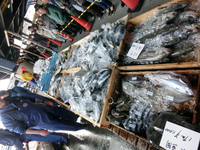 久しぶりですが、今日は鮮魚は有りません。 ところが、2/25に「おじゃマップ」のロケがあり、3/8PM7:00から放映されたので大混雑です。ゴールデン・タイムにローカルネタやる時代か(?)。 仲卸組合(仲買人)を軸に3ブースと、いつも通りの場外市場6店です。 場外は柑橘類(ミカン、デコポン…)、薩摩揚げ、干物などですが、いずれも生産者の顔が見えるので親しみが持てます。 今日買ったのは「訳あり(キズ入り)デコポン\200/1kg」で、良品\300と比べて味は同じだけどキズが有るので傷み易いとの事です(味はネーブルオレンジに近い)。この店では「はば海苔\2,500/2枚入り」も売っており、自分(オバチャン)で採った物で市価の半額程度との事です。