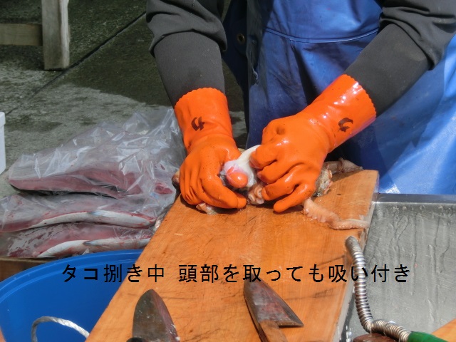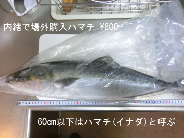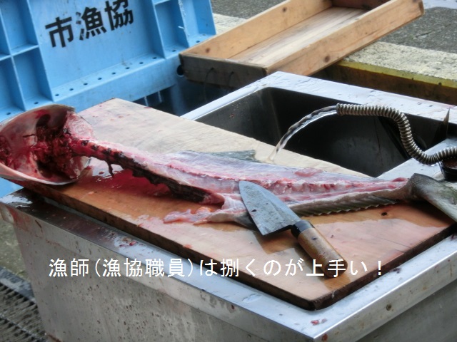 AM08:40朝市に鮮魚が並ぶ。ヒラメ\1,500〜\2,500(約\1,500-/1kg=安い)、石鯛\1,000〜\2,000、マトウ鯛\1,200〜\1,800、真鯛\2,000(いずれも\1,000/kg=安い)、ホウボウ\600、ヤリイカ(小)\200と並んでいるがどうも食指が伸びない。 ところで、鮮魚の旨さを保つには「活〆=グサリと一撃で絶命」が一番で、血が全身に回らないので旨いそうです。その上位には「神経締め」があり、一瞬で絶命するのでなお旨いらしい。
